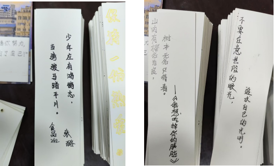 11 月底活动伊始,在校园内的启幕便吸引了众多学子的踊跃参与。精美书签化身心灵与书籍的纽带,同学们满怀热忱,在书签上倾吐心声。或文采斐然,或激昂励志,或深情款款的留言,如灵动音符奏响校园文学旋律,似希望种子播撒心田,点燃文学热忱,铸就坚韧品格,赋予同学们直面困境的无畏勇气。