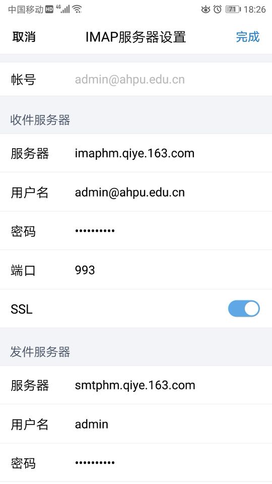 3、在可选择的协议中选择“IMAP”,收件服务器中输入“imaphm.qiye.163.com”,发件服务器输入“imaphm.qiye.163.com”。用户名填写的例子“***@ahpu.edu.cn”,示例如下: