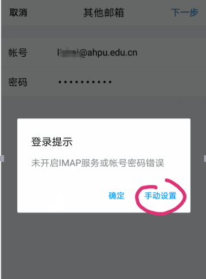 2、输入学校邮箱账号和密码,点击“下一步”,在弹出的登录提示中选择“手动设置”,