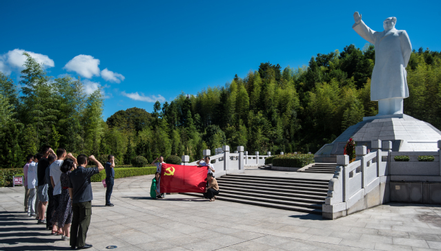 在古田会议会址旁修建的7.1米高汉白玉毛泽东同志雕像前,学员代表向主席雕像献上花篮,一起向毛泽东雕像三鞠躬,深切缅怀老一辈革命家的丰功伟绩。接着,全体学员面向党旗,右手握拳,重温入党誓词。之后,全体学员逆时针环绕主席像一周,了解镌刻在雕像背面的毛泽东在闽西进行革命实践活动及雕像的简要情况,以及毛泽东在闽西留下的书法诗词。全体学员被革命领袖在中共革命道路上的思想境界和乐观的革命心态所折服。