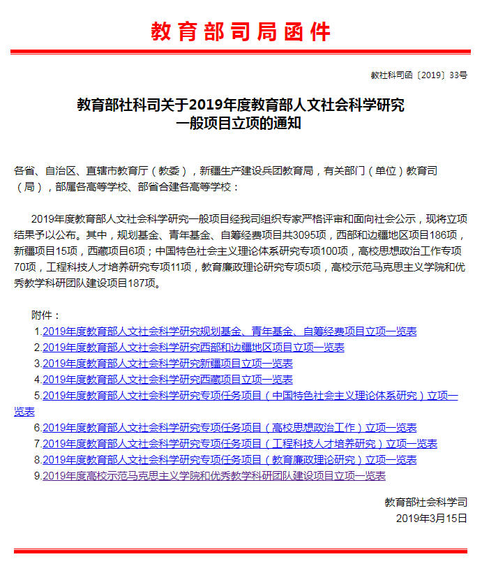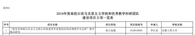 近日,经教育部社科司组织专家严格评审并面向社会公示,2019年度教育部人文社会科学研究一般项目现已公布立项结果。我校马克思主义学院副院长李红星主持申报的课题《“把培育和践行社会主义核心价值观贯穿思想政治理论课教学全过程”教学模式研究》获批高校示范马克思主义学院和优秀教学科研团队建设项目(重点选题)。教育部高校示范马克思主义学院和优秀教学科研团队建设项目旨在对思政课建设、马克思主义理论学科建设和马克思主义学院建设中的基础理论问题、重大理论问题与现实问题进行研究,支持建设一批示范马克思主义学院,支持建设一批优秀科研团队和一批优秀教学改革团队,并对取得了较好的教学效果,在全国具有开创性的思政课教学改革的具体实践做法,进行推广普及。2019年,全国共计立项50项。