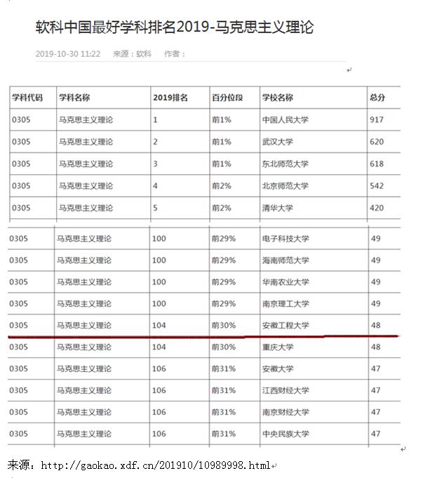 10月30日,软科正式发布2019“中国最好学科排名”,我校马克思主义理论学科上榜,位列第104位,在安徽省内高校中位列合肥工业大学、安徽师范大学之后,居第3位。