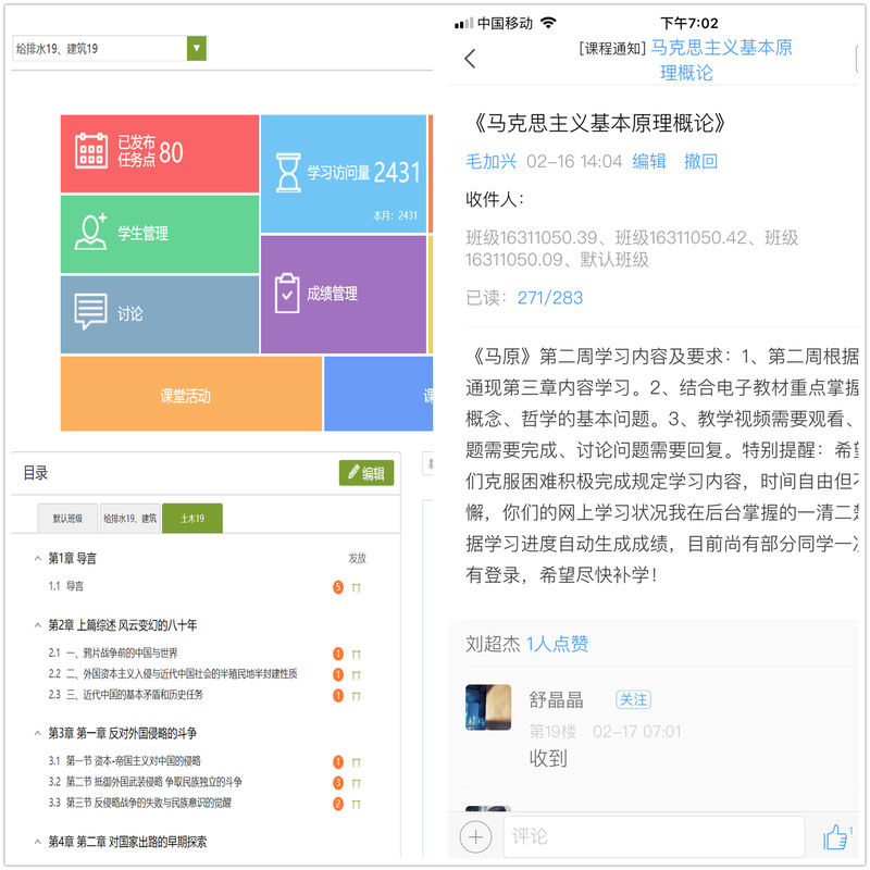 2020年1月底,马院按照教育部和省教育厅关于疫情防控工作相关部署和要求,第一时间做好线上教学准备。及时出台《马克思主义学院新冠肺炎疫情防控期间思想政治理论课教学工作安排》和《2020年春季学期马克思主义学院思想政治理论课线上教学工作方案》,明确线上教学总体要求、任务内容及时间节点,并对线上教学管理、教学资源和教学纪律等进行要求。学院充分利用QQ、微信群等工具传达上级精神,组织全体思政课教师加强信息化教学能力培训,优化网络教学内容,确保线上教学质量。
