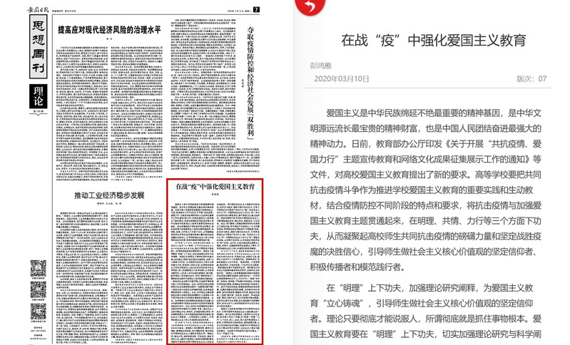 3月10日,《安徽日报》思想周刊·理论版刊发我校马克思主义学院教授彭鸿雁同志署名文章《在战“疫”中强化爱国主义教育》。文章指出,高等学校要把共同抗击疫情斗争作为推进学校爱国主义教育的重要实践和生动教材,“要在‘明理’上下功夫,加强理论研究阐释,为爱国主义教育‘立心铸魂’”,“要在‘共情’上下功夫,涵育爱党爱国爱社会主义的真挚情感”,“要在‘力行’上下功夫,推动爱国精神转化为强国报国的自觉行动”,从而凝聚起高校师生共同抗击疫情的磅礴力量和坚定战胜疫魔的决胜信心,引导师生做社会主义核心价值观的坚定信仰者、积极传播者和模范践行者。