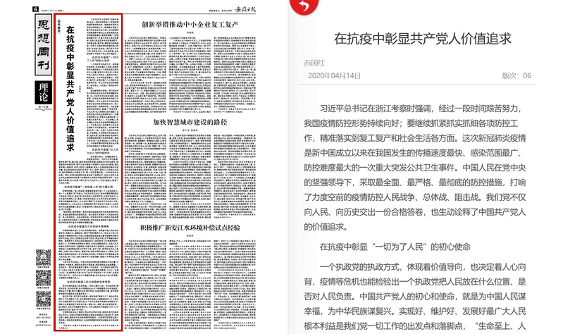 4月14日,《安徽日报》思想周刊·理论版刊发我校党委副书记、马克思主义理论学科带头人苏国红同志署名文章《在抗疫中彰显共产党人价值追求》。文章从五个维度生动诠释抗疫斗争中彰显的中国共产党人的价值追求。文章强调,面对新中国成立以来在我国发生的传播速度最快、感染范围最广、防控难度最大的一次重大突发公共卫生事件,中国共产党人始终坚守“‘一切为了人民’的初心使命”、始终坚信“以人民为中心”的价值理念、始终坚定“一切依靠人民”的力量之源。在这场抗击疫情的斗争中, 历久弥新的中国精神充分彰显,中国集中力量办大事的制度优势充分彰显。文章指出,中国特色社会主义制度之所以有这样的优势,是因为我们党始终把立党为公、执政为民落实到国家治理的各领域各方面各环节,坚持全国一盘棋,确保党中央决策部署贯彻落实。这是我们党领导全国人民取得一切胜利的重要保证,也是我国国家制度和治理体系优势的根本所在。