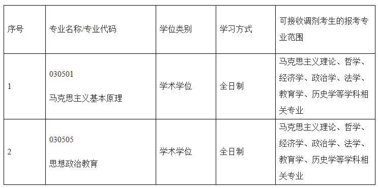 2、由于各学校初试科目设置及难度存在差异,从学院对考生日后学习和高质量科学研究的要求出发,调剂遵循考试难度与我校相同或相近的原则;优先接收考生第一志愿报考学科为马克思主义理论,其次接收哲学、经济学、政治学、法学、教育学、历史学等学科相关专业,且须达到所报考一志愿国家控制分数线。