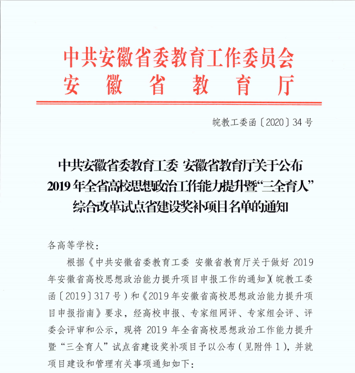2019年安徽省高校思想政治能力提升暨“三全育人”综合改革试点省建设奖补项目