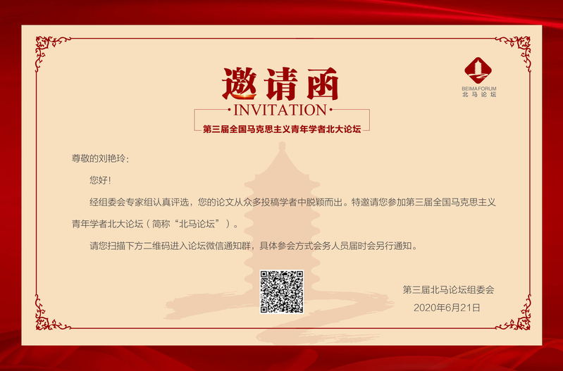 6月28日,由北京大学马克思主义学院、北京大学习近平新时代中国特色社会主义思想研究院、北京大学中国特色社会主义理论大众化与国际传播协同创新中心主办的第三届“全国马克思青年学者北大论坛”线上会议,马克思主义学院18级研究生刘艳玲以《论健康中国的理论渊源与实践价值》一文受邀参加此次云端会议,并获得会议优秀论文。