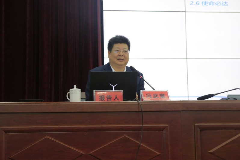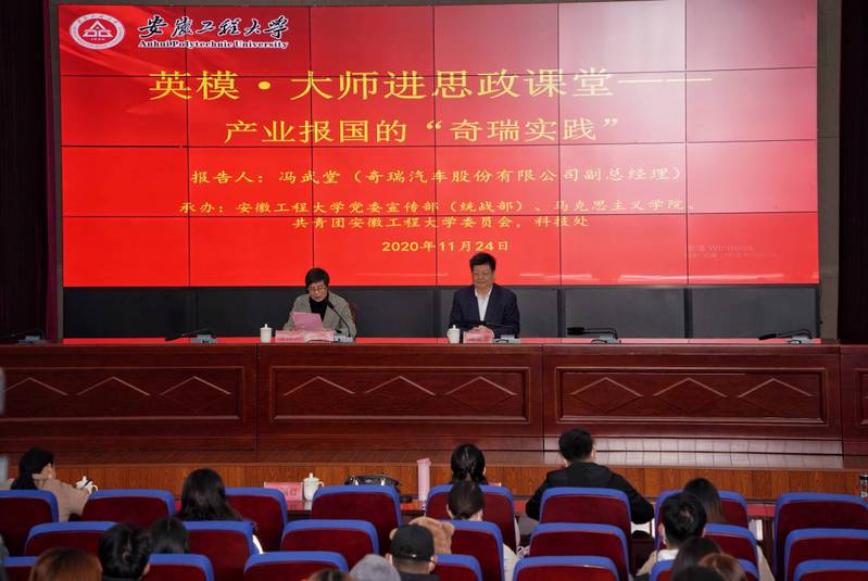 11月24日上午,由我校主办,校党委宣传部、马克思主义学院、校团委、科技处联合承办的“英模·大师进思政课堂”主题报告在图书馆五楼会议室举行。荣获“中国企业海外形象20强”的奇瑞汽车股份有限公司副总经理、安徽省“十五”发展创新工程先进个人称号和“五一劳动奖章”获得者冯武堂走进思政课堂,以“产业报国的‘奇瑞实践’”为题,为来自全校各学院的300余名大学生带来了一堂精彩的爱国教育课、人生引领课。校党委副书记苏国红主持报告会并致辞。奇瑞大学宣传干事苑玲娟、校党委宣传部主要负责人、马克思主义学院党政班子成员、思政课教师等聆听报告会。