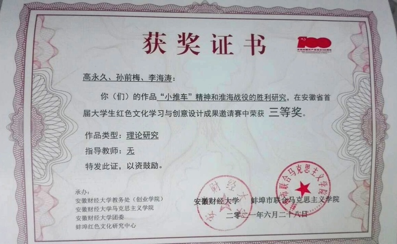 近日,由安徽财经大学、蚌埠市联合马克思主义学院主办的安徽省首届大学生红色文化学习与创意设计成果邀请赛获奖名单公布,我院研究生王玉创作的《青年学生传承红色基因的基本路径探索——以六安市区为例》荣获二等奖、高永久创作的《“小推车”精神和淮海战役的胜利研究》荣获三等奖。
