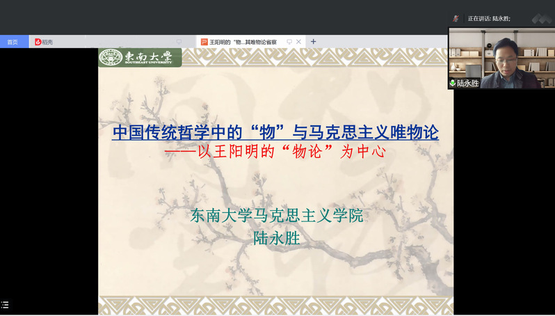 4月28日下午,江苏紫金文化社科英才、东南大学马克思主义学院陆永胜教授受邀为马克思主义学院全体专兼职思政课教师和研究生,作题为“中国传统哲学中的‘物’与马克思主义唯物论:以王阳明的‘物论’为中心”的专题报告。本场报告是今年马克思主义学院雷竞技rebent 月的第三场报告,报告采用腾讯会议形式。马克思主义学院刘聪教授主持报告会。