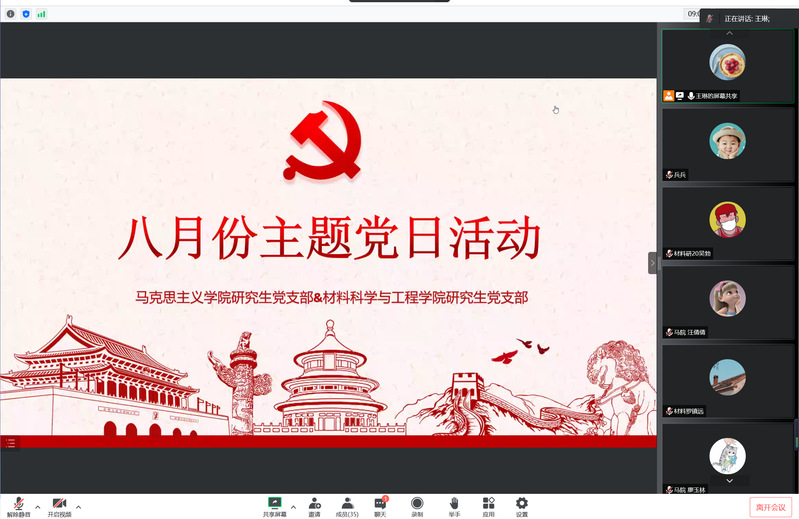 8月31日,马克思主义学院研究生党支部、材料科学与工程学院研究生党支部共同开展政治理论学习活动,旨在达到党建结对共建、资源共享、优势互补、互促发展、共同提高的目的。本次活动通过腾讯会议举行,共建双方支部全体党员参加。