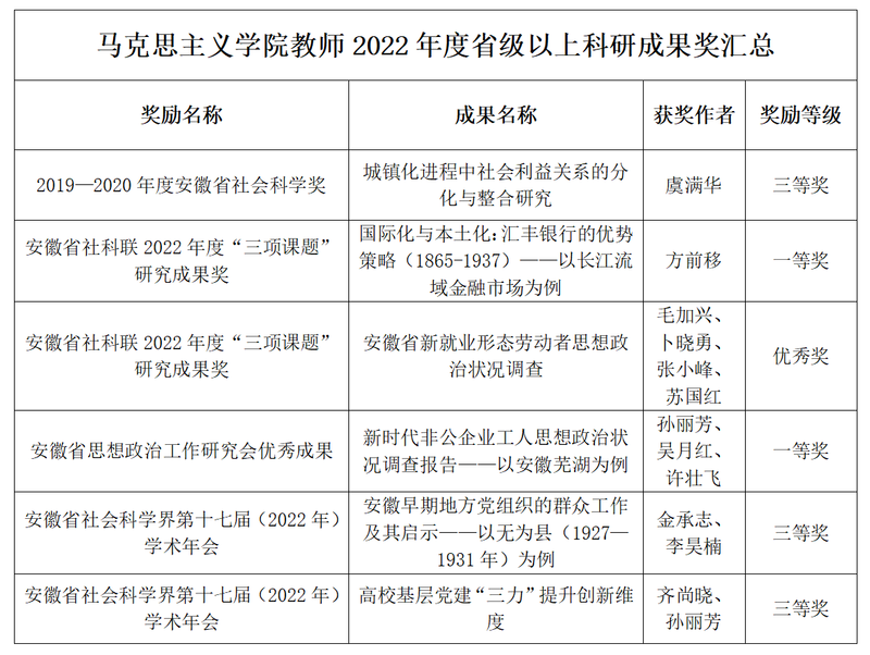 2022年,马克思主义学院教师积极申报各类科研成果奖项,取得可喜成绩,共获得省级以上科研成果奖6项,包括安徽省社科奖三等奖1项,安徽省社科联“三项课题”一等奖1项、优秀奖1项,安徽省思想政治工作研究会优秀成果一等奖1项,安徽省社会科学界第十七届(2022年)学术年会三等奖2项。一项获奖成果代表安徽省参加中国政研会的全国评比活动。