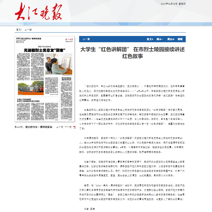 为贯彻落实党的二十大精神,讲好红色故事,让红色基因代代相传,推进“三全六专”育人实践走深走实,马克思主义学院组织研究生志愿者团队在芜湖烈士陵园长期开展义务讲解志愿服务活动,受到了芜湖市烈士陵园管理处高度认可,取得一定的社会影响力。4月5日的《大江晚报》以“大学生’红色讲解团’在市烈士陵园接续讲述红色故事”为题报道了马克思主义学院研究生志愿者团队的事迹。
