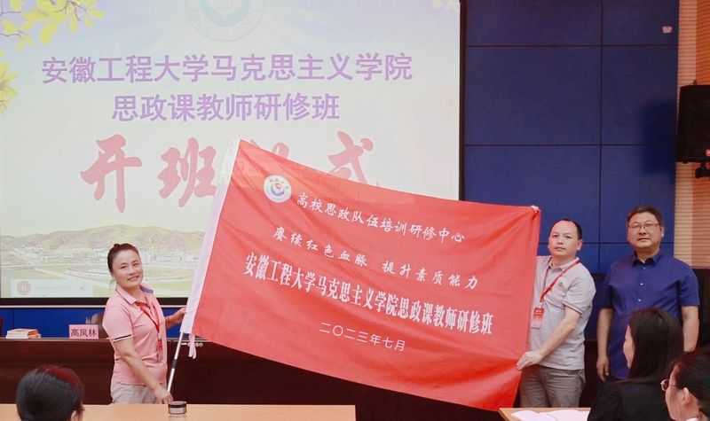 研修班开班式在庄严的国歌声中拉开帷幕,高校思想政治工作队伍培训研修中心(延安大学)办公室主任、马克思主义学院副院长高凤林出席并致辞。他向参加研修的全体思政课教师表示热烈欢迎,并简要介绍延安大学的基本情况和教育部高校思想政治工作队伍培训研修中心(延安大学)的特色办学情况。刘伟作开班动员讲话,他说延安精神培育了一代代中国共产党人,是我们党的宝贵精神财富,学习延安精神,对于思政课教师而言,既是一次实践研修,也是一次党性教育。他要求老师们带着初心使命从学习中汲取信仰的力量,严格遵守研修纪律,保质保量完成各项研修任务,在讲深讲透讲活思政课上下好功夫。开班式上,吴月红代表学院接受了本次研修班班旗。
