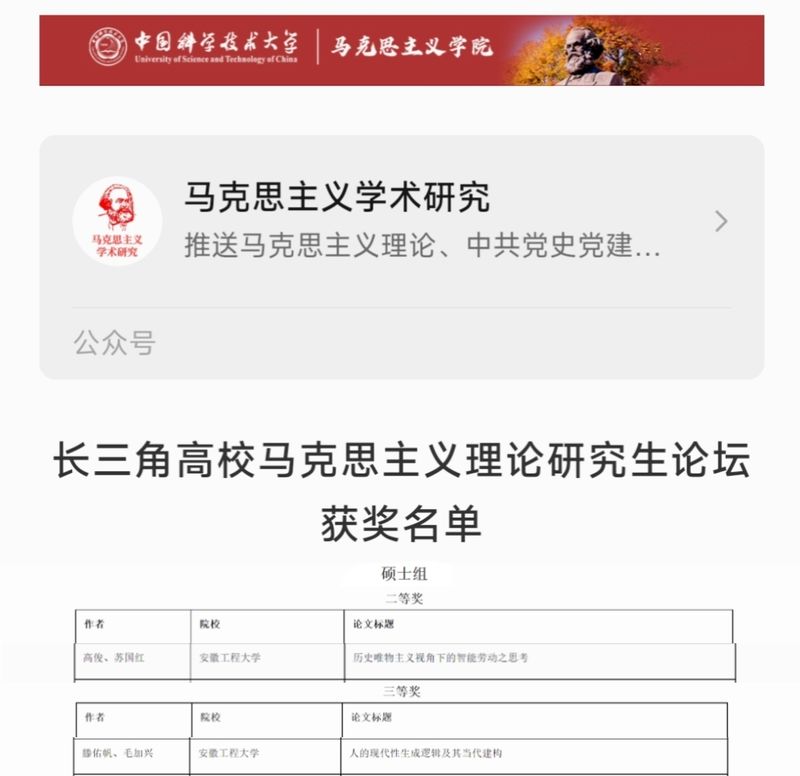 为深化对习近平新时代中国特色社会主义思想和党的二十大精神的学习与研究阐释,不断开辟当代中国马克思主义和21世纪马克思主义新境界,加强高校马克思主义理论学科人才培养与交流,12月23日,首届长三角高校马克思主义理论研究生论坛在中国科学技术大学举办。我校马克思主义学院2022级研究生高俊受邀参会。