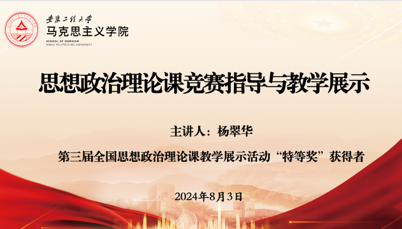8月3日,马克思主义学院特邀第三届全国思政课教学展示活动特等奖获得者、芜湖职业技术学院马克思主义学院教师杨翠华来院做思政课教师教学展示活动参赛指导与示范教学。学院教学副院长刘德军、教研部主任、中青年骨干教师参加本次讲座。