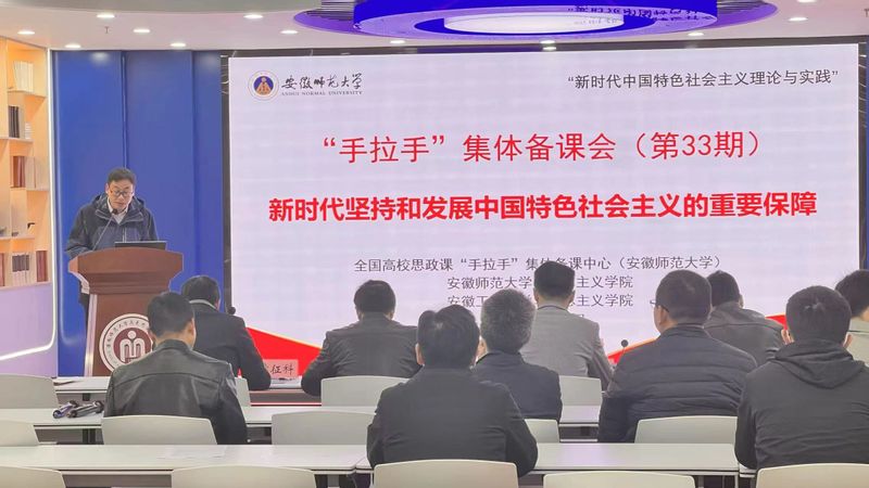 11月20日下午,由全国高校思政课“手拉手”集体备课会中心(安徽师范大学-安徽省)、安徽师范大学马克思主义学院承办的第33期“手拉手”集体备课会线下在安徽师范大学马克思主义学院3楼情景模拟实验室与教育部集体备课中心“云上大练兵”线上平台同步举行。