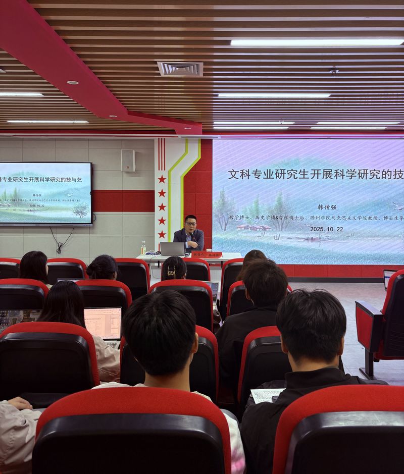 1022日,滁州学院马克思主义学院教授韩传强受邀作题为“文科专业研究生开展科学研究的技与艺”的学术讲座。学院教师代表、全体研究生参加。讲座由学院教授委员会主任虞满华教授主持。