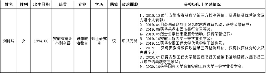 根据《关于做好2021年安徽省普通高等学校优秀毕业生(研究生)评选工作的通知》要求和《马克思主义学院推荐安徽省优秀毕业生评选细则》,本着公平、公正、公开的原则,在具有参评资格的研究生申请的基础上,经学院评审委员会评议推荐,并经学院党政联席会议研究通过,现将学院拟推荐名单予以公示如下: