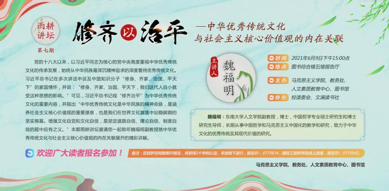 党的十八大以来,以习近平同志为核心的党中央高度重视中华优秀传统文化的传承发展,始终从中华民族最深沉精神追求的深度看待优秀传统文化。习近平总书记在多次讲话中谈及中国知识分子“修身、齐家、治国、平天下”的家国情怀,并说:“修身、齐家、治国、平天下,我们这代人自小就受这种思想的影响。”可见,习近平总书记视“修齐治平”为中华优秀传统文化的重要内容,并指出“中华优秀传统文化是中华民族的精神命脉,是涵养社会主义核心价值观的重要源泉,也是我们在世界文化激荡中站稳脚跟的坚实根基。增强文化自觉和文化自信,是坚定道路自信、理论自信、制度自信的题中应有之义。”本期雨耕讲坛邀请您一起聆听魏福明副教授就中华优秀传统文化与社会主义核心价值观的内在关联展开的精彩讲解。