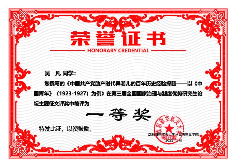 8月6日,由沈阳航空航天大学研究生院和马克思主义学院主办、辽宁省思政课名师工作室和沈阳市四史教育研究中心承办的第三届“全国国家治理与制度优势”全国研究生论坛以线上视频会议的形式召开。马克思主义学院2020级研究生吴凡参加此次论坛,他提交的论文《中国共产党助产时代弄潮儿的百年历史经验探赜——以<中国青年>(1923-1927)为例》荣获一等奖,并在分论坛进行主题交流发言。