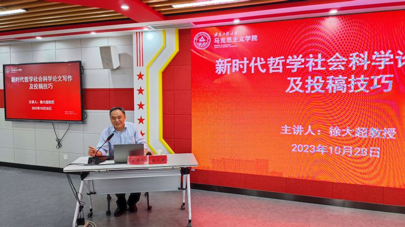 为帮助学院师生明确学术论文写作规范,提升论文写作能力,交流论文投稿经验,10月28日上午,学院举办学术论文写作及投稿经验交流会。《南阳理工学院学报(社科版)》编辑主任徐大超教授受邀作题为“新时代哲学社会科学论文写作及投稿技巧”的专题报告,安徽师范大学马克思主义学院2021级硕士研究生胡忠婷给全体研究生作朋辈学习经验交流。学院副院长李海涛主持交流会。学院全体研究生和部分教师参会。