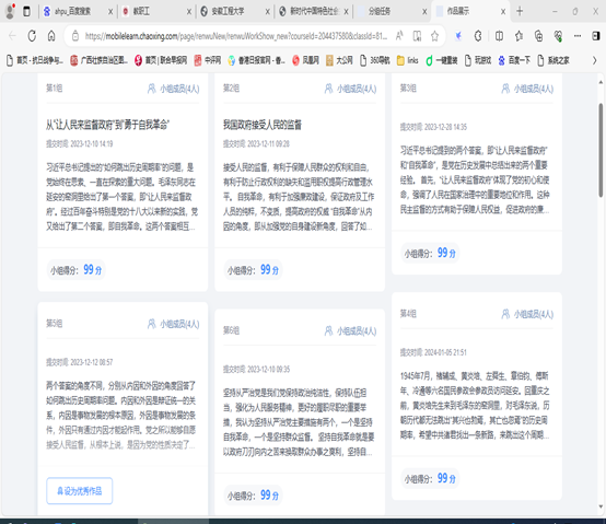 课程组充分利用网络资源,辅助硕士研究生思政课教学。本课程采用了11个党史研究和教育领域权威专家讲座,设置在每个教学专题之后,让学生在正常的公共思政课学习之外能够深化党史、国史学习,充实了思政课的教学内容。同时,为了增强课程教学的现实针对性,精选了与教材内容高度契合的案例,组织案例教学。通过案例的学习,联系教材内容,促进学生对理论和实践问题的深入思考。当前,已设置了党的十九届五中全会精神、十九届六中全会精神和党的二十大报告专题学习。