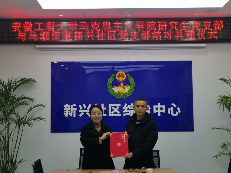 12月13日下午,马克思主义学院研究生党支部与马塘街道新兴社区党支部结对共建签约仪式在新兴社区举行。学院党总支副书记、研究生党支部书记裴利萍,研究生辅导员王明以及党支部委员参加签约仪式。签约仪式由新兴社区党支部书记王明东主持。此次共建旨在深入学习贯彻党的二十届三中全会精神和习近平总书记考察安徽重要讲话精神,进一步推动学院研究生党建工作提质增效。