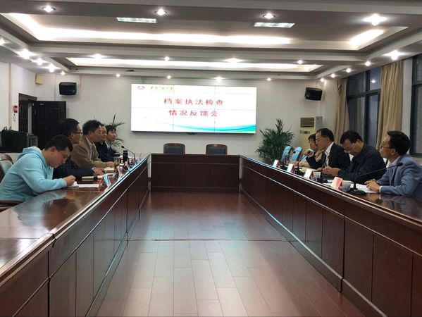 10月22日下午,由省档案局、省教育厅联合组成的档案行政执法检查组,在省档案局法规处处长邱旻的带领下对我校开展档案行政执法检查工作。副校长郭兴众接待了检查组一行并出席检查反馈会,办公室主任王弘、副主任黄炜和学校档案专职人员陪同检查并参加了反馈会。