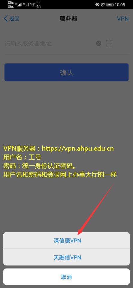 打开E-Mobile7,点击界面右上角的“VPN”,然后选择“深信服VPN”、输入vpn相关信息(服务器网址https://vpn.ahpu.edu.cn),点击连接;