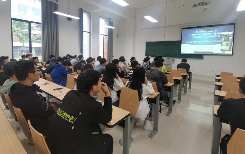 Mark Steffka教授以“Introduction to Communications System Design Engineering—Using Software Designed Receivers”为题,深入浅出、图文并茂地为学生介绍了电气工程专业的内涵,讲述了其在通信系统设计、使用软件定义接收器等方面的相关知识,为学生带来了生动的一课。