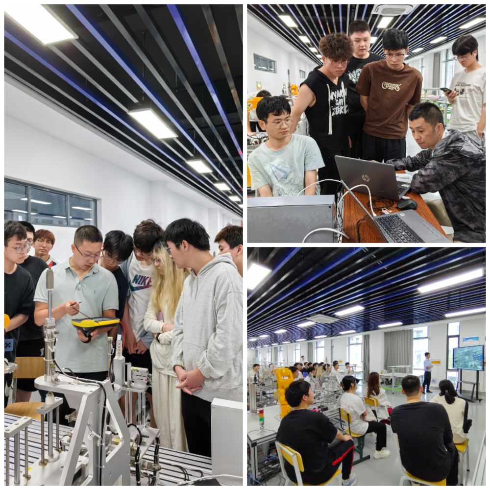 上海理工大学16名同学和我校人工智能学院16名同学组成暑期研修班,利用机器人现代产业学院实验室,完成了工业机器人认知实验和机器人协同作业实验等教学任务。在黄胜洲老师指导下,完成了工业机器人虚拟拆装和实体拆调实验。在鞠锦勇和苏学满老师指导下,完成了滚动轴承自动装配流程规划、夹具装调、电气装调、组网和编程示教等教学内容。