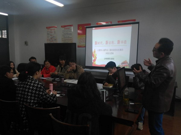 党的十九大对深化机构和行政体制改革作出重要部署,要求统筹考虑各类机构设置,科学配置党政部门及内设机构权力、明确职责。与会同学结合公共管理理论,进行了热烈的讨论和交流。最后赵宏斌老师对此次国务院机构改革具体举措和背后的逻辑发表了学习体会,并作“新时代新征程新举措”的报告。