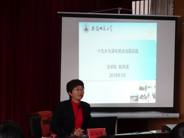 3月25日上午,安徽师范大学法学院院长、博士生导师彭凤莲教授来我校,作了题为“十九大报告中的法治音符”的学术报告。报告会由人文学院副院长周伟主持,人文学院“经典悦读”活动全体成员及部分教师参加了报告会。