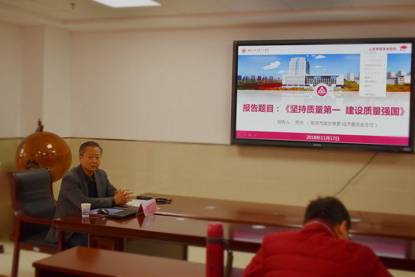 2018年11月17日上午,人文学院MPA校外导师、芜湖市政协常委、经济委员会主任周光,芜湖市公共资源交易管理局党组成员、副局长江兵来我院做学术报告。报告会由人文学院MPA中心副主任张勇主持,人文学院2018级全体研究生、其他年级研究生代表以及部分教师参加了报告会。