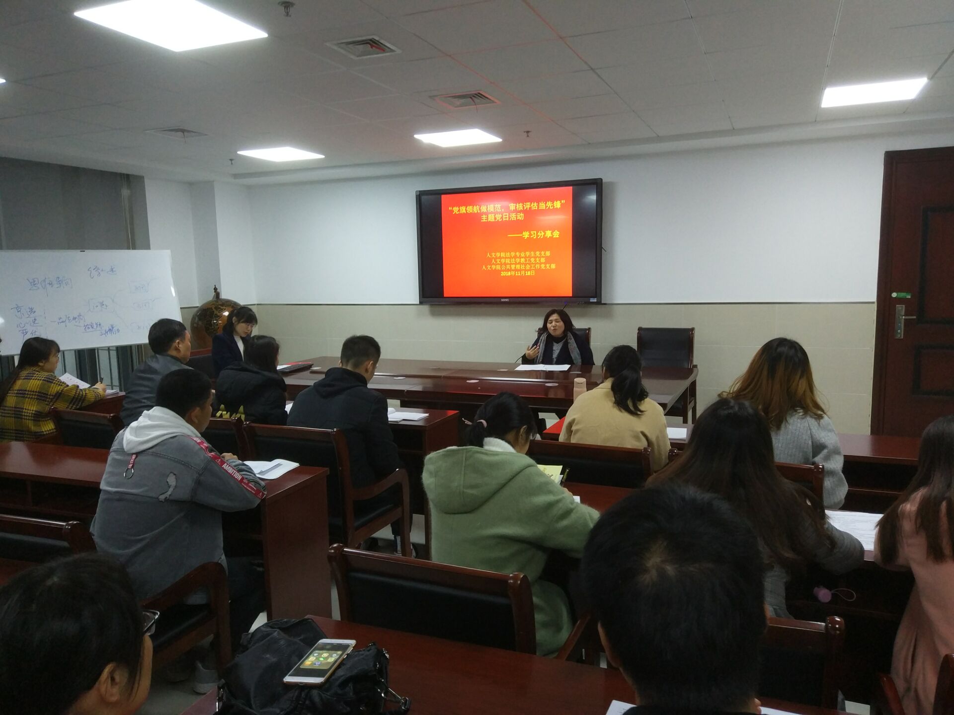 11月21日人文学院公共管理社会工作教工党支部召开全体党员会议,开展“党旗领航做模范,审核评估当先锋””主题党日活动。