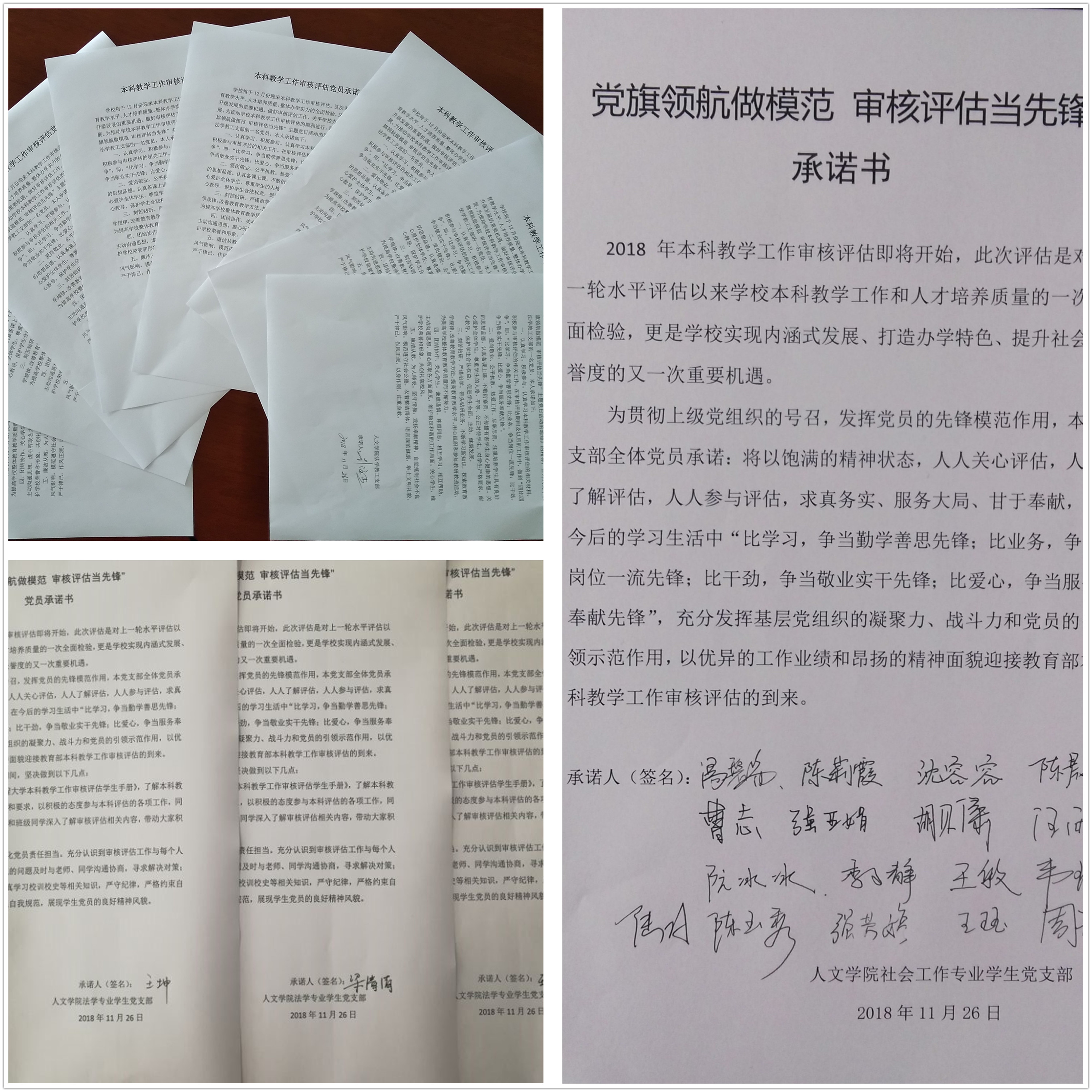 “一名党员,一面旗帜,一个承诺,一份奉献”,在学院老师的见证下,法学161班杨瑞华等95名学生党员、发展对象郑重地在“党旗领航做模范 审核评估当先锋”承诺书中签上自己的姓名,学生党员在日常和组织活动中要佩戴党员徽章,公开亮出自己的身份。