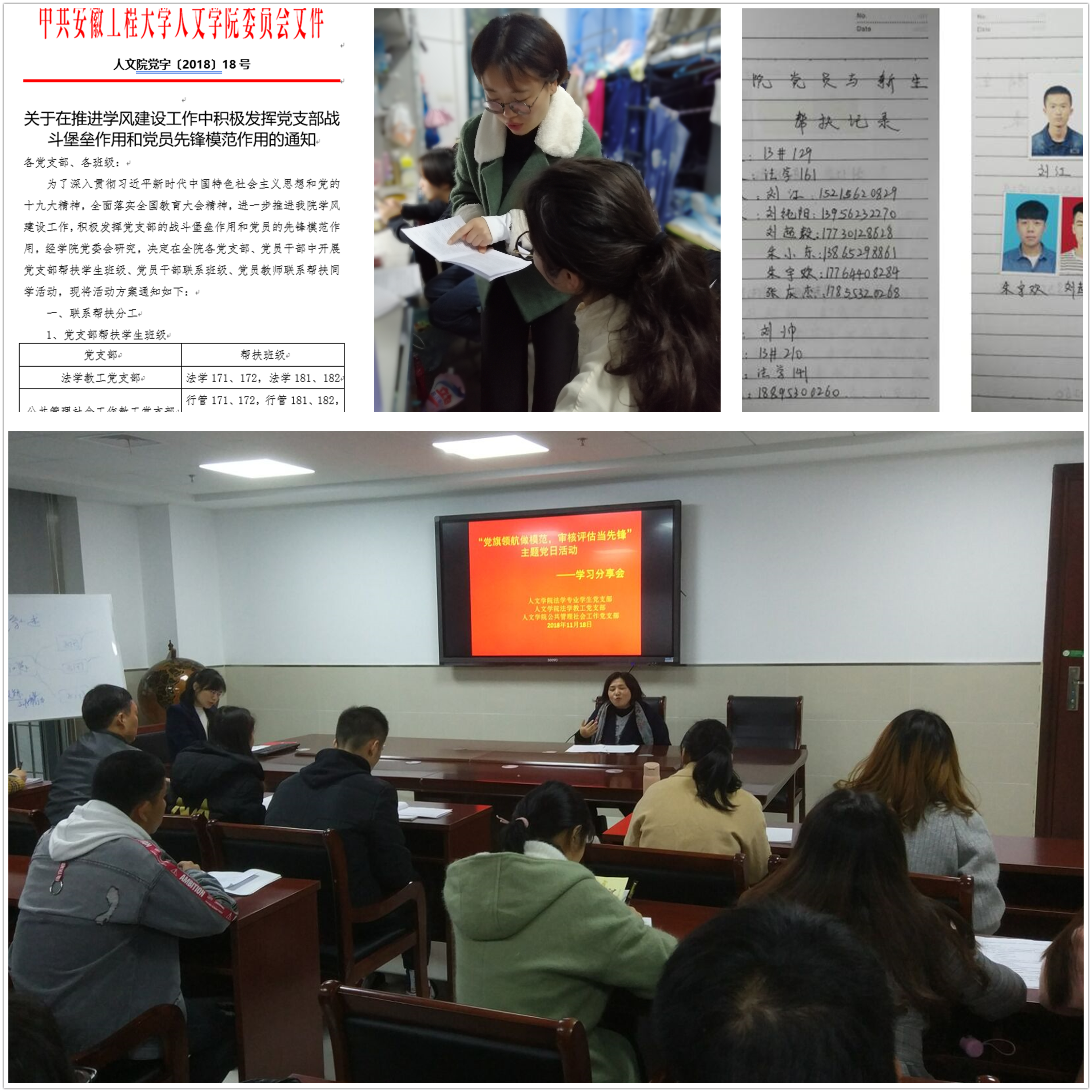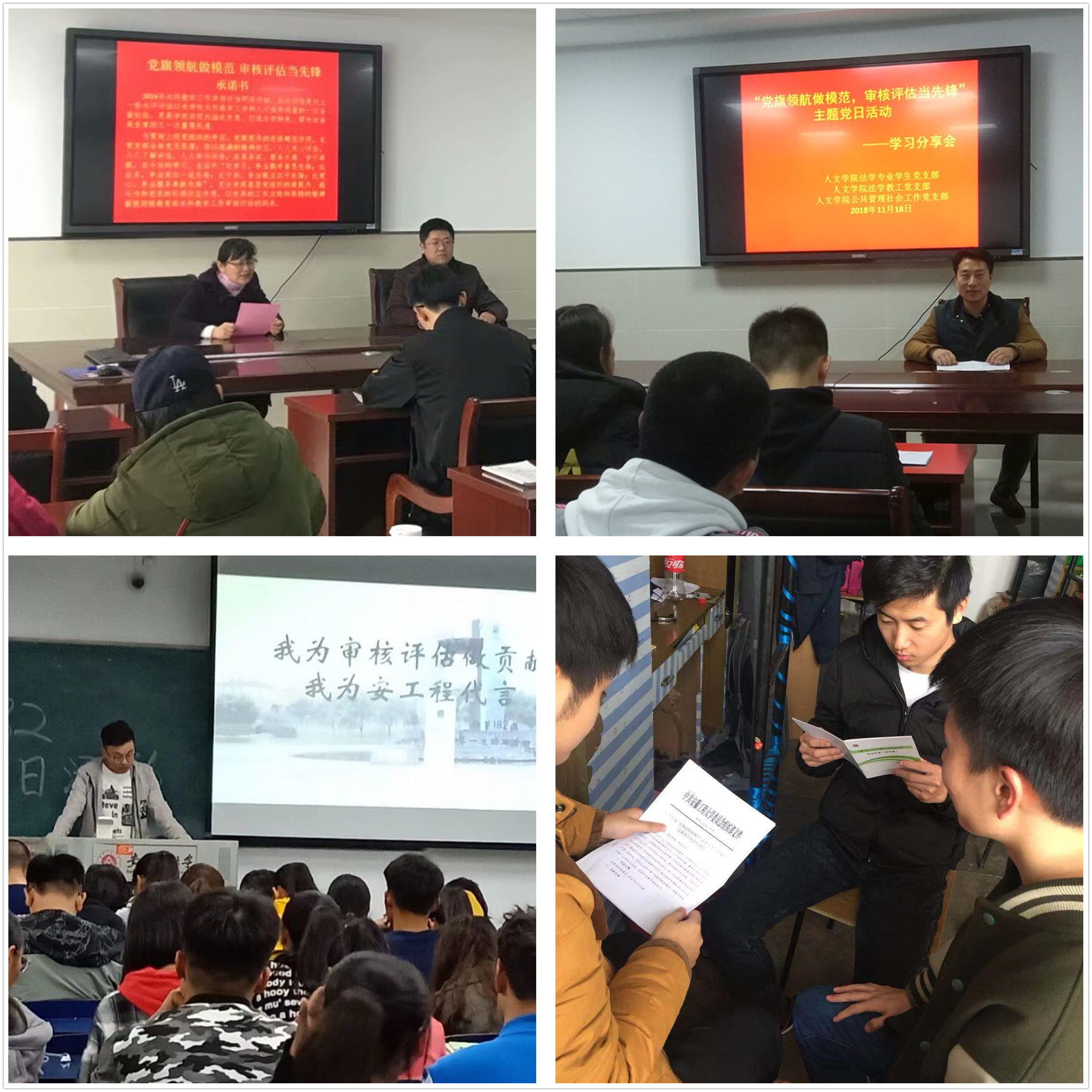 自2018年11月初,人文学院扎实开展“党旗领航做模范 审核评估当先锋”主题党日活动,学院党政领导、教工党员、学生党员、发展对象及教工党支部、学生党支部、党校等开展分层次、有针对性的本科审核评估学习宣传教育活动,充分发挥基层党组织的战斗堡垒和党员的先锋模范作用。