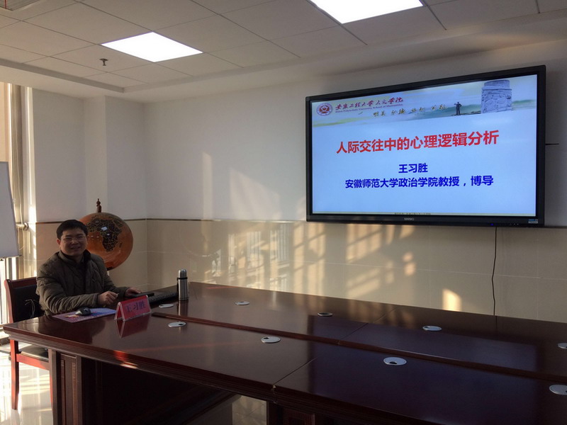 2018年12月23日下午15:00,应人文学院的邀请,安徽师范大学政治学院博导、安徽省学术与技术带头人、安徽省宣传文化领域(社科理论类)拔尖人才、安徽省高校人文社会科学重点研究基地安徽师范大学马克思主义研究中心常务副主任王习胜教授,在新图书馆1307教室作题为《人际交往中的心理逻辑分析》的学术报告。报告会由人文学院院长刘军主持,2018级公共管理专业(MPA)和创意产业与社会管理专业全体研究生参加了报告会。