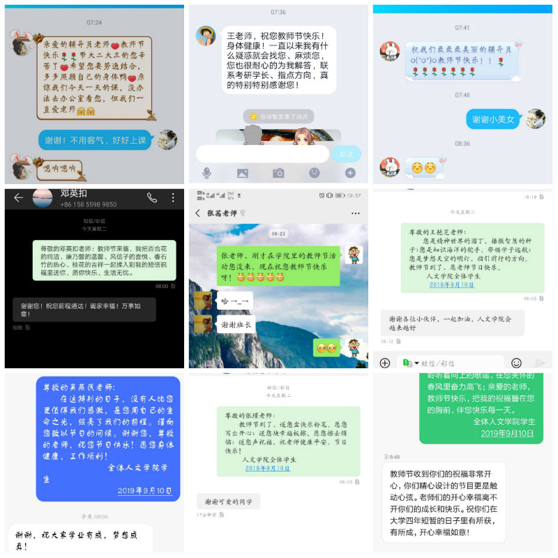 节日当天,人文学院学生会早早将精心准备的教师节展板摆放在办公室楼下,营造出尊师重教的节日气氛,吸引不少同学驻足观看。人文学院学生会成员江周说:“老师倾注了大量的时间与精力将我们培养成才,却总是默默付出,不求回报。借这次机会,我们也希望能表达自己的感激之情,对老师说一声辛苦了。”叮咚叮咚一份份短信祝福早早的从老师的手机中响起。