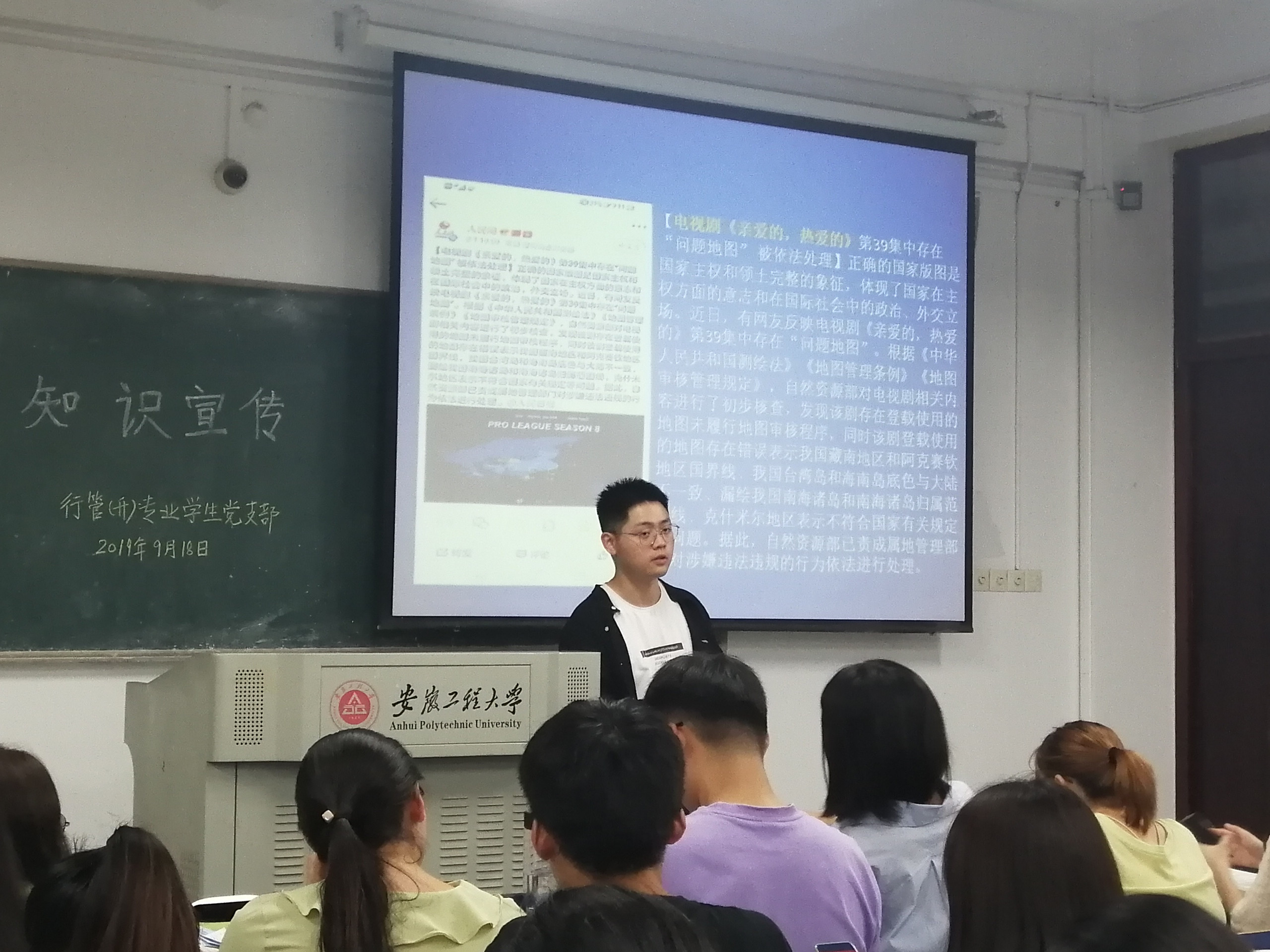 2019年9月18日晚7时,人文学院行政管理(升)专业学生党支部组织党员、2019级行政管理(升)新生班级共同开展“祖国在我心中——国家版图知识宣传”主题党日活动,支部全体党员及2019级新生80余人共同参加。