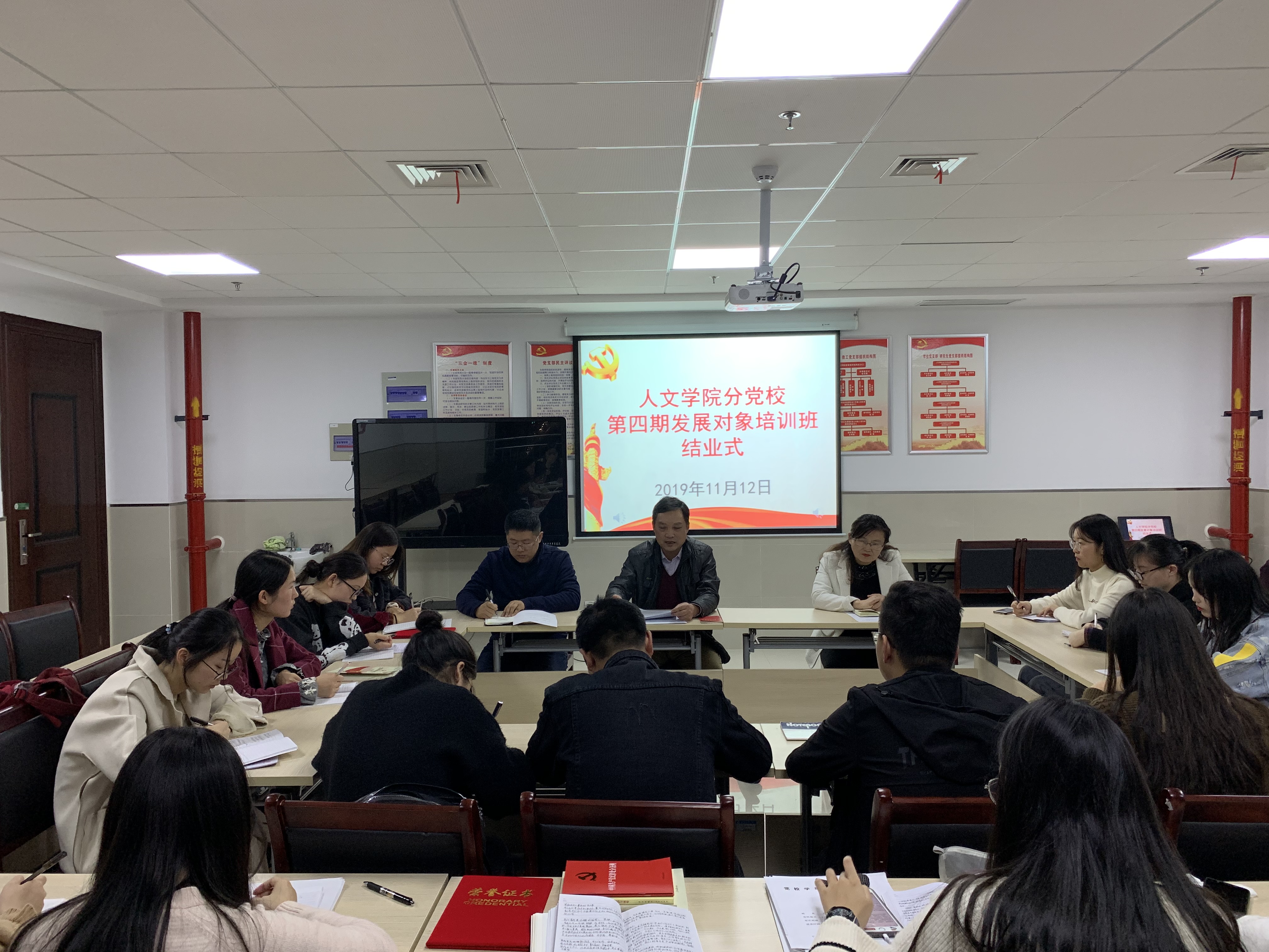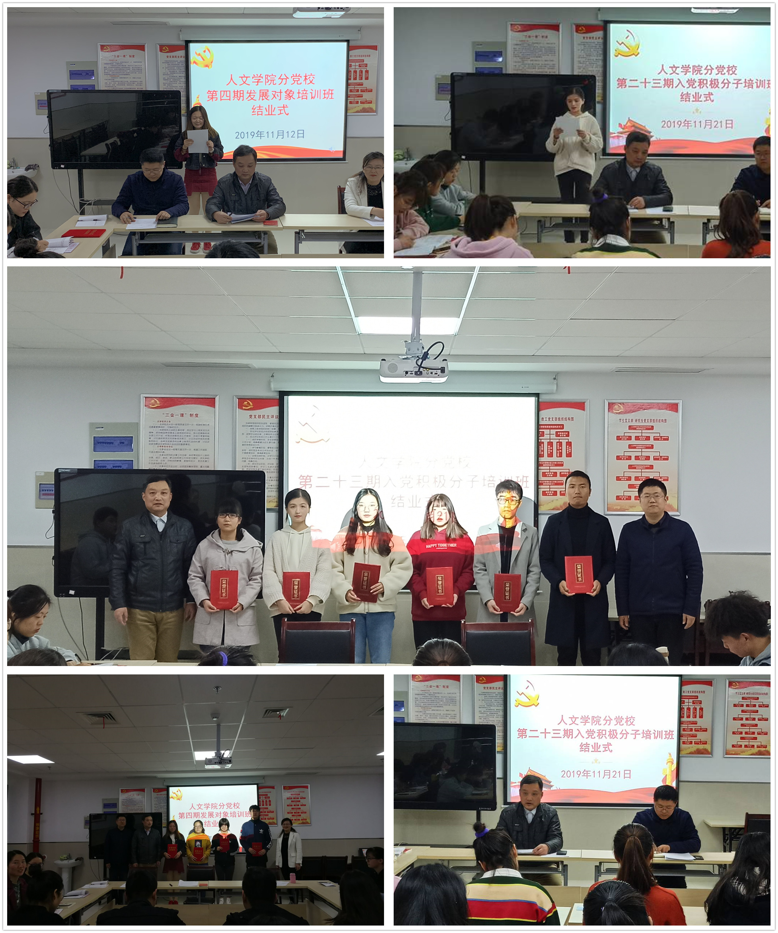 近日,人文学院分党校第四期发展对象培训班、第二十三期入党积极分子培训班圆满完成培训计划,分别于11月12日、11月21日在新图1415室举行结业式。人文学院党委书记邓英扣、党委副书记金艾裙、组织员兼培训班班主任刘海涛、全体学员共同出席结业式。