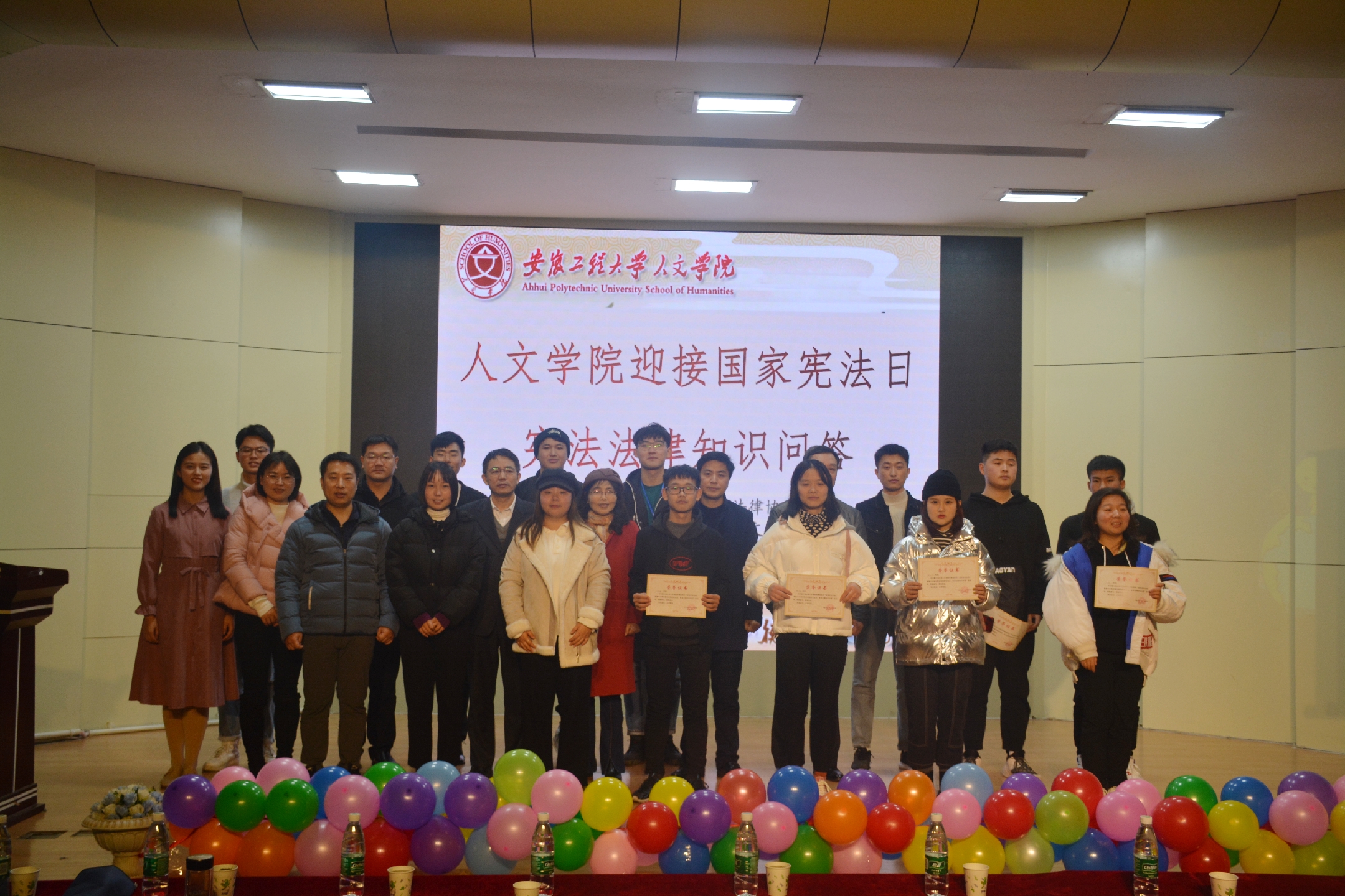 在第六个国家宪法日来临之际,为了弘扬宪法精神,树立宪法权威,普及宪法法律知识,人文学院于12月3日晚在学术报告厅举办“迎接国家宪法日,宪法法律知识问答”活动。人文学院党委书记邓英扣、副院长周伟、法学系主任杜蓓蕾以及法学系教师党支部和法学专业学生党支部的党员出席了本次活动。