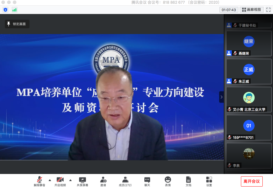 2020年5月23日-2020年5月24日,“MPA培养单位‘应急管理’专业方向建设及师资培训研讨会”成功在线上召开,此次会议由全国公共管理专业学位研究生教育指导委员会举办,旨在进一步明确MPA应急管理专业方向建设,促进MPA应急管理教学研讨和交流。来自全国MPA培养单位的400多名教师参加了本次会议,我院行政管理系教师路稳玲参加了会议。
