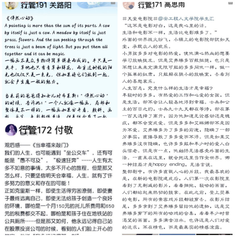 由于疫情的影响,学生们不得不居家学习,离开老师面对面的指导,同学的陪伴,可能会有许多的烦恼和问题积压在心里,无处倾诉、无法解决。为了帮助学生们减轻困扰,以积极的心态面对生活,此次心理健康节特别挑选了不同种类、有益于心理健康的电影。有关于童年回忆、成长心路历程的《天堂电影院》,关于自我意识与人格成长的《少年派的奇幻漂流》,关于恋爱心理的《怦然心动》,以及关于追求幸福的《当幸福来敲门》等六部电影。同学们满怀热情,积极参与,纷纷在空间、朋友圈中讨论对电影的感慨及看法,情真意切,感人肺腑。法学192夏宝云从《三傻大闹宝莱坞》中感悟到友情,爱情,教育对自身的成长与发展的非凡意义;行管172付敬从《当幸福来敲门》中感受到只要心中有梦想,那点点的希望,终将会在这片土地上洒下光芒;法学191关路阳从《怦然心动》中了解到看人看事要看到整体,不能管中窥豹;法学192杨丹则从《心灵捕手》中感悟到生命的多姿多彩,面对生活要敞开心扉,从容处世。