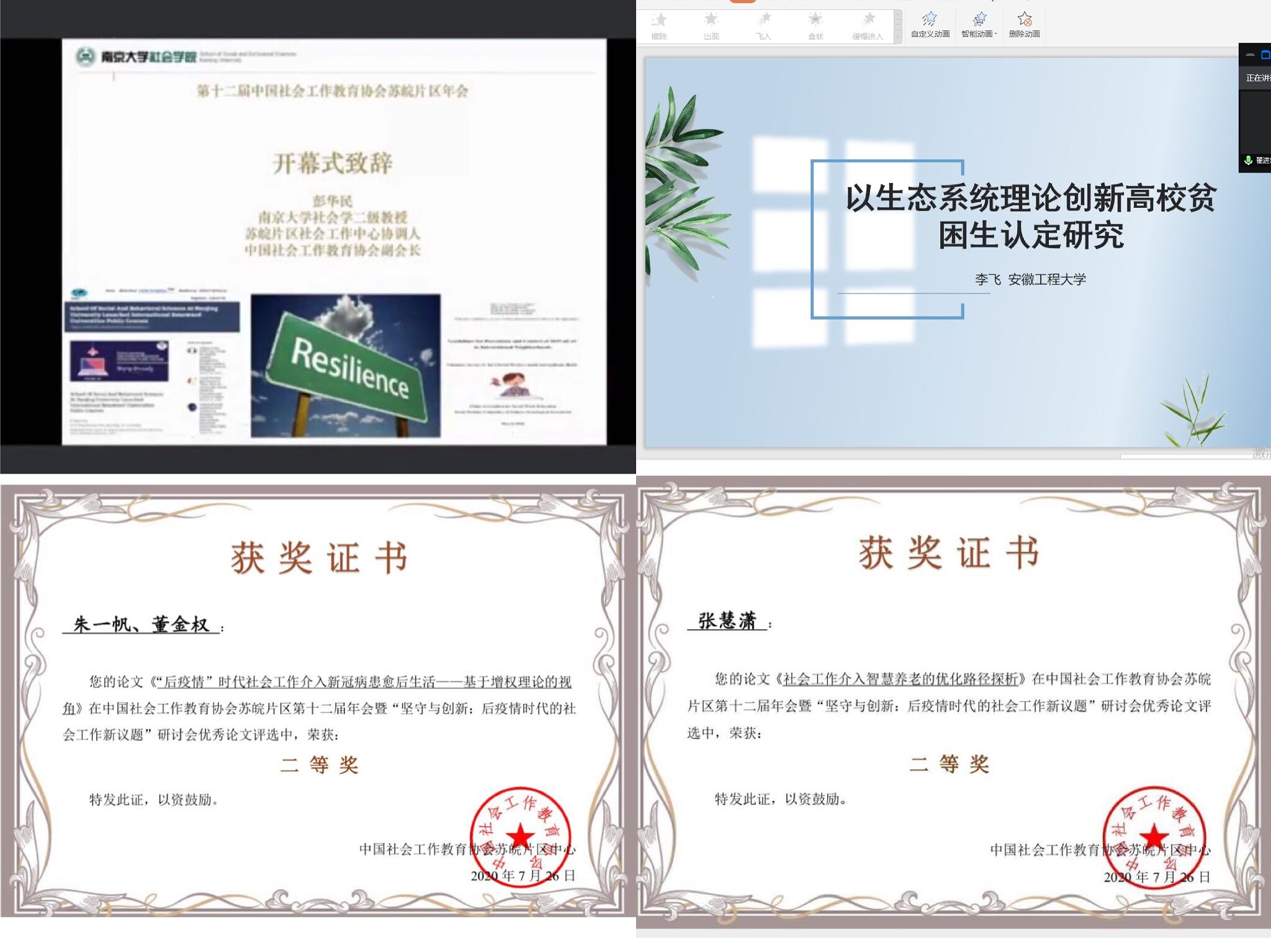 2020年7月24—26日,中国社会工作教育协会苏皖片区中心主办,东南大学人文学院社会学系、东南大学MSW教育中心承办的第十二届中国社会工作教育协会苏皖片区年会成功在线上举办,我院教师李飞、周纯、党委副书记金艾裙教授及部分2019级社会工作硕士研究生参加了本次会议。