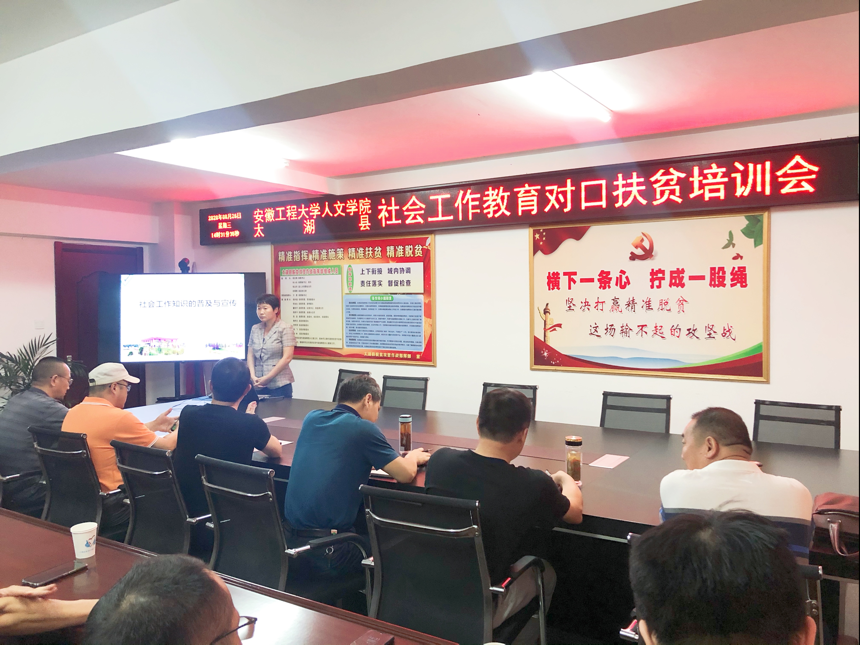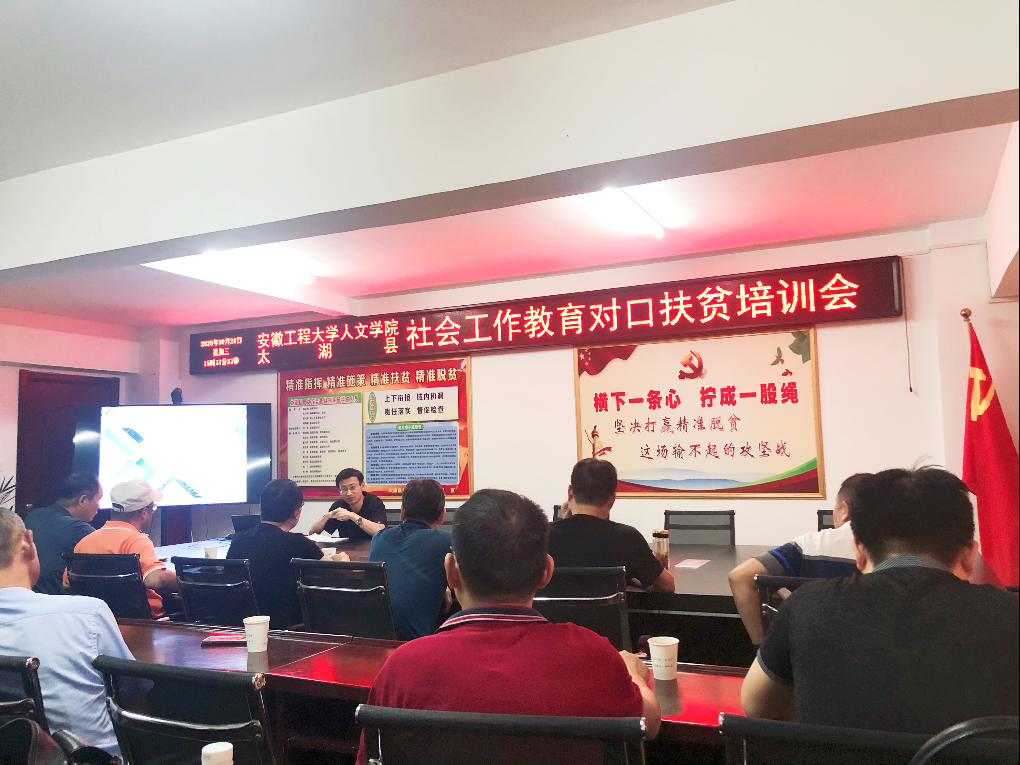 下午,吴燕民和胡军分别给太湖县扶贫办的扶贫干部与当地的基层社区工作人员,开办了《社会工作知识普及和宣传》与《扶贫开发与乡村振兴》两场专题讲座。吴燕民主要从社会工作的概念、功能、核心价值观以及应用原则五个方面向大家普及了社会工作的基本知识,同时详细介绍了社会工作师考试的相关要求与复习要点。本次社会工作专业知识培训讲座,加深了贫困地区干部群众对社会工作的了解与认识,鼓励支持他们积极参加全国社会工作者职业水平考试,从而推动干部群众应用社会工作理念、专业知识和方法开展扶贫工作,为社会工作助力扶贫提供了有益的指导。