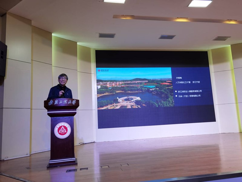 浙江洲际出入境服务有限公司总经理,尤味(宁波)贸易公司创始人许振烽,以“博学创新,实干笃行”为主题,总结凝炼出 “坚定目标,矢志不渝”“保持格局,开阔眼界”“无论东西,相信自己”“不断学习,不断进步”“创新思维,整合资源”“放下姿态,实干笃行” 这六点创业所需品质。他在与同学们分享自身的创业经历和工作经验的同时也深刻地阐述了创业历程中应当勇面挫折,不言放弃,敢于创新的道理。