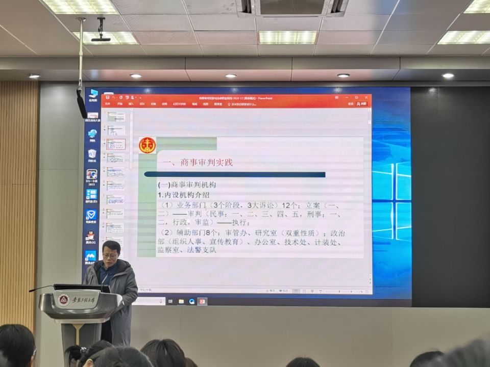 12月24日下午,人文学院第一期“法学论坛”在5教117教室如期举行。本次论坛邀请芜湖市中级人民法院民二庭文勇庭长作了题为“商事审判实践与法律职业规划”的报告。报告由人文学院法学系主任杜蓓蕾老师主持;法学系教师张雷、鲍雨,法学19级、20级、法学辅修专业学生参加了报告会。